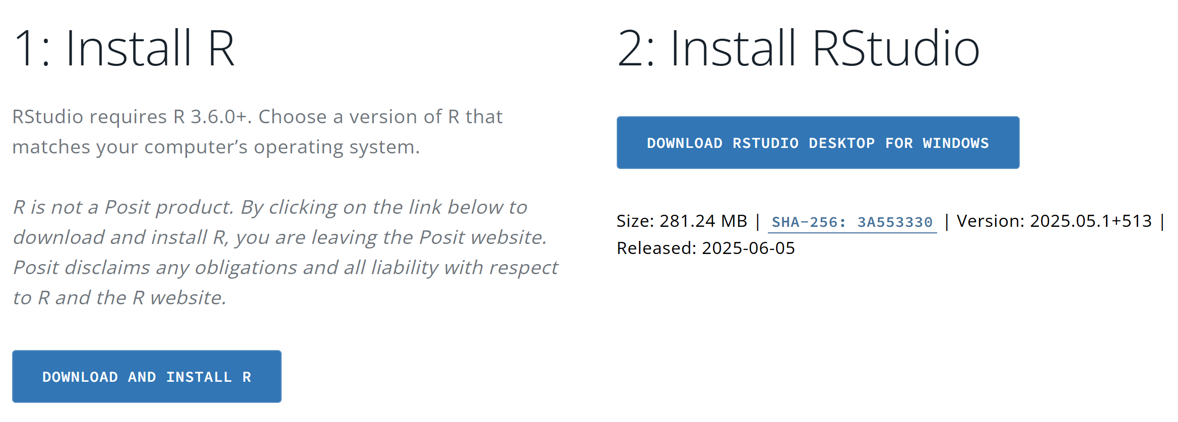 R의 지배적인 IDE(Integrated Development Environment, 통합개발환경)인 RStudio를 설치한다. 다시 원래의 다운로드 페이지로 돌아와, 오른편의 다운로드 바를 클릭하면 윈도우즈용 RStudio의 파일을 다운로드할 수 있다. 스크롤 다운하면 다른 운영체계를 위한 RStudio를 다운로드할 수 있다. 다운받은 RStudio를 자신의 디바이스에 설치한다. 이 다큐먼트 작성 시점 기준으로 RStudio의 최신 버전은 2025년 9월에 발표된 2025.09.2+418이다.