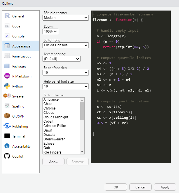 Rstudio의 기본 세팅값을 바꿀 수 있는 다양한 옵션이 존재한다. Tools > Global Options를 선택하면 그림 3 과 같은 화면을 볼 수 있을 것이다.