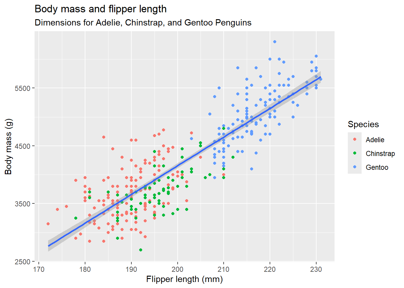 x = "Flipper length (mm)", y = "Body mass (g)", # 축의 이름을 지정