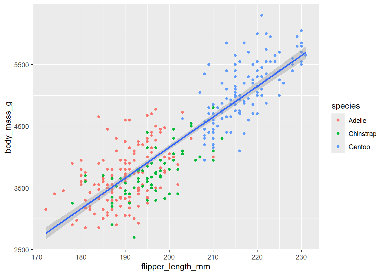 mapping = aes(x = flipper_length_mm, y = body_mass_g, color = species) # 종별로 색상을 지정