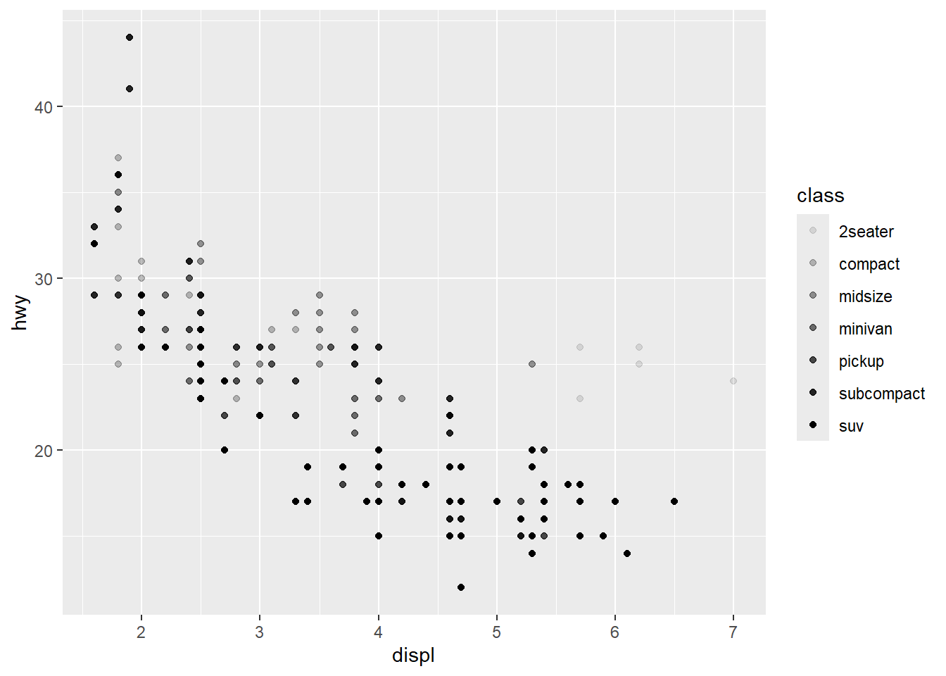 geom_point()ggplot(mpg, aes(x = displ, y = hwy, alpha = class)) +