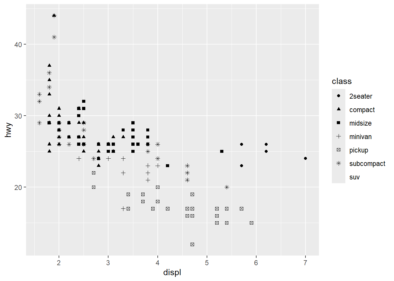 geom_point()ggplot(mpg, aes(x = displ, y = hwy, shape = class)) +