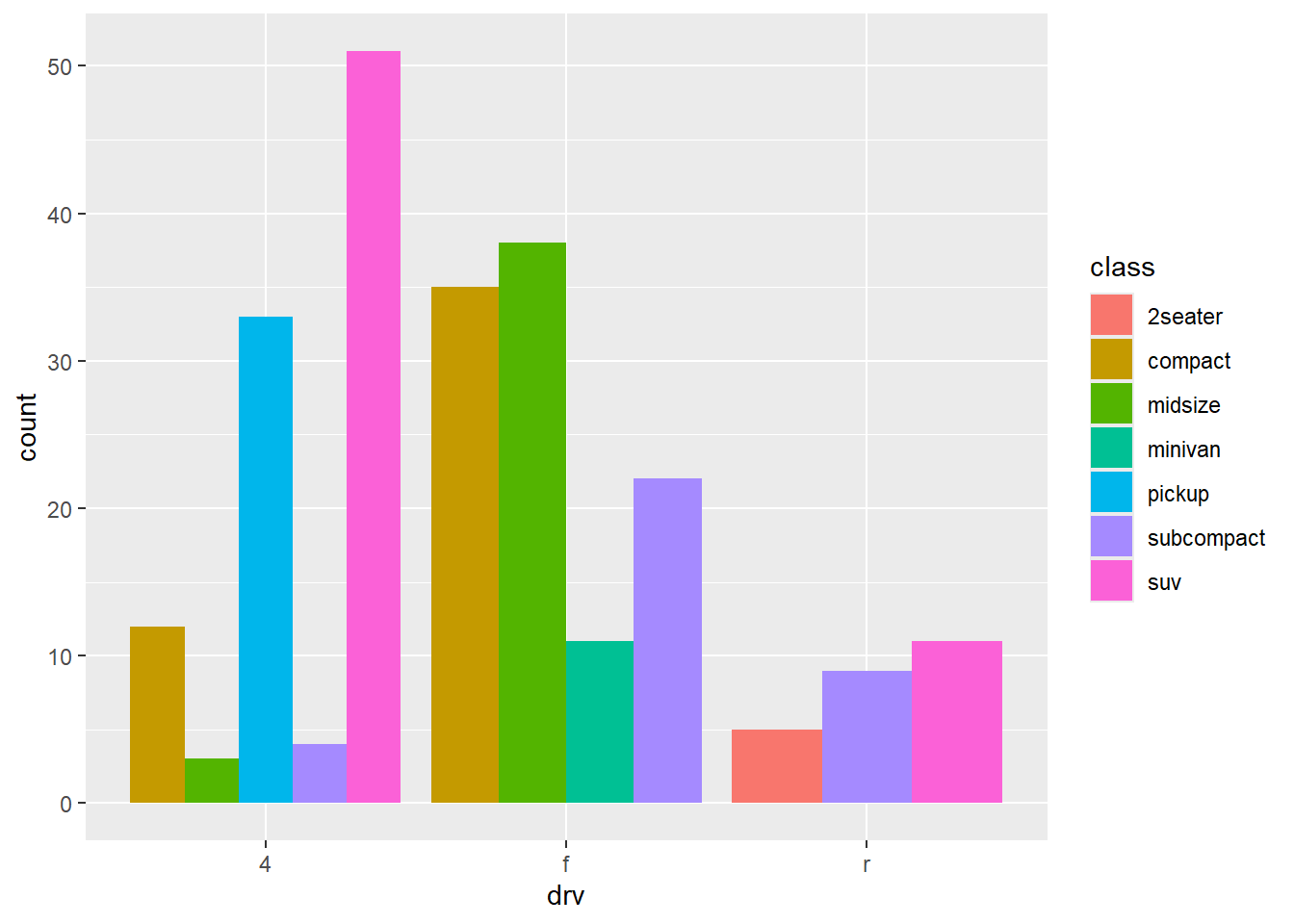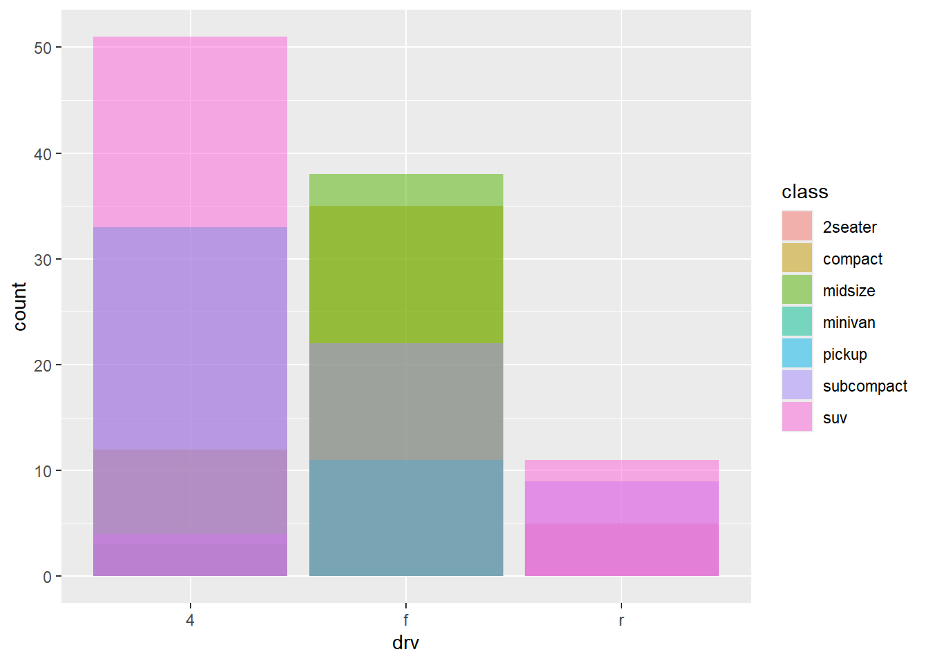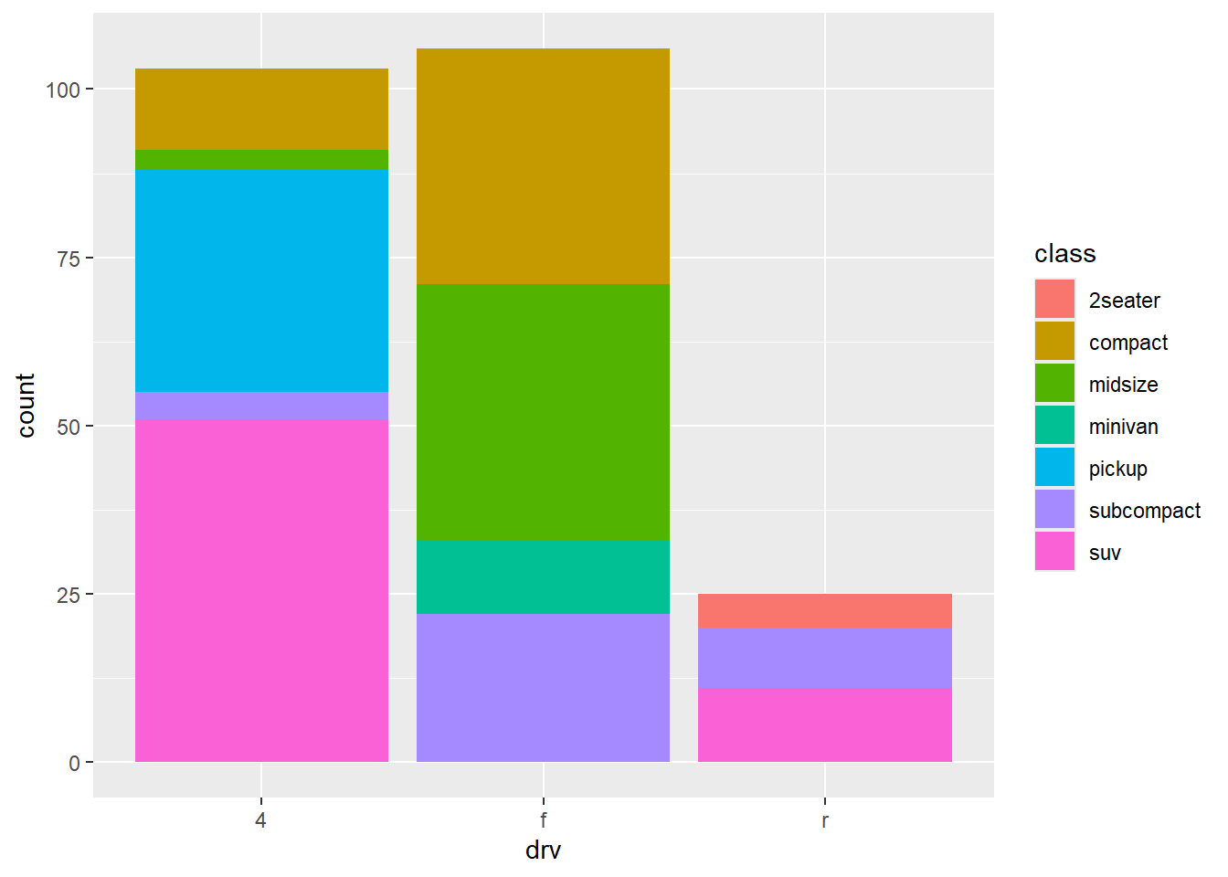 ggplot(mpg, aes(x = drv, fill = class)) +
