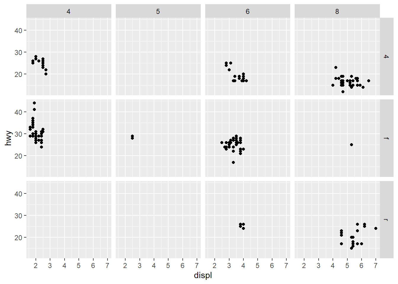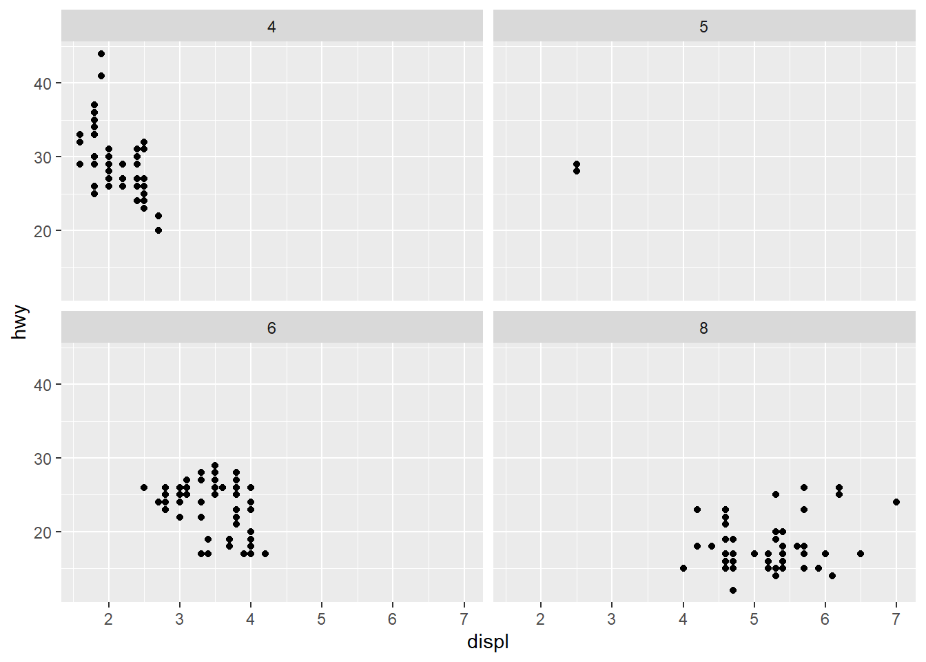 facet_wrap(~cyl)두 개의 변수에 의거해 패싯을 생성할 수도 있다. facet_wrap() 함수 대신 facet_grid() 함수가 적용된다.
