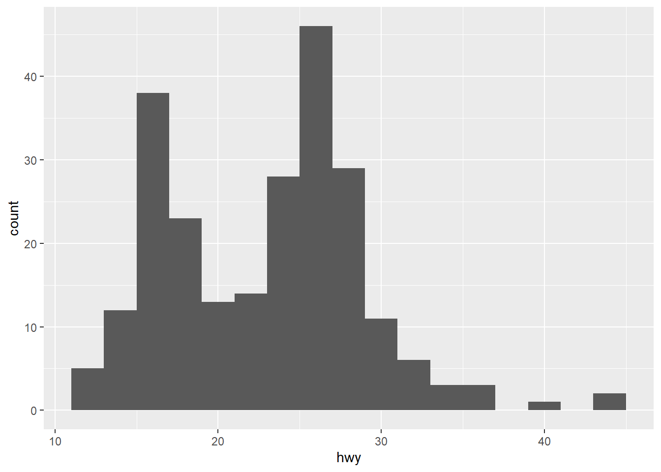ggplot(mpg, aes(x = hwy)) +