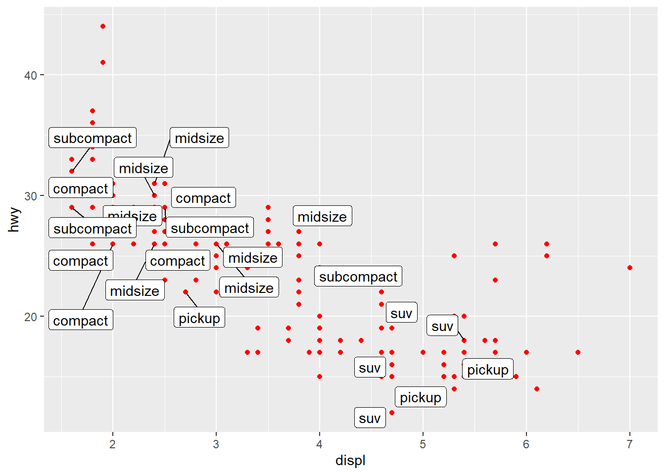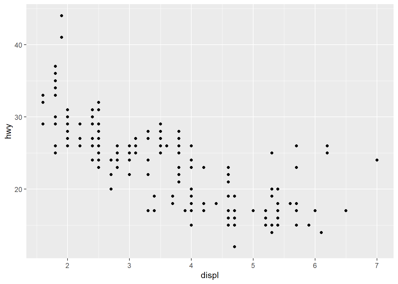 p1 <- ggplot(mpg, aes(x = displ, y = hwy)) +
