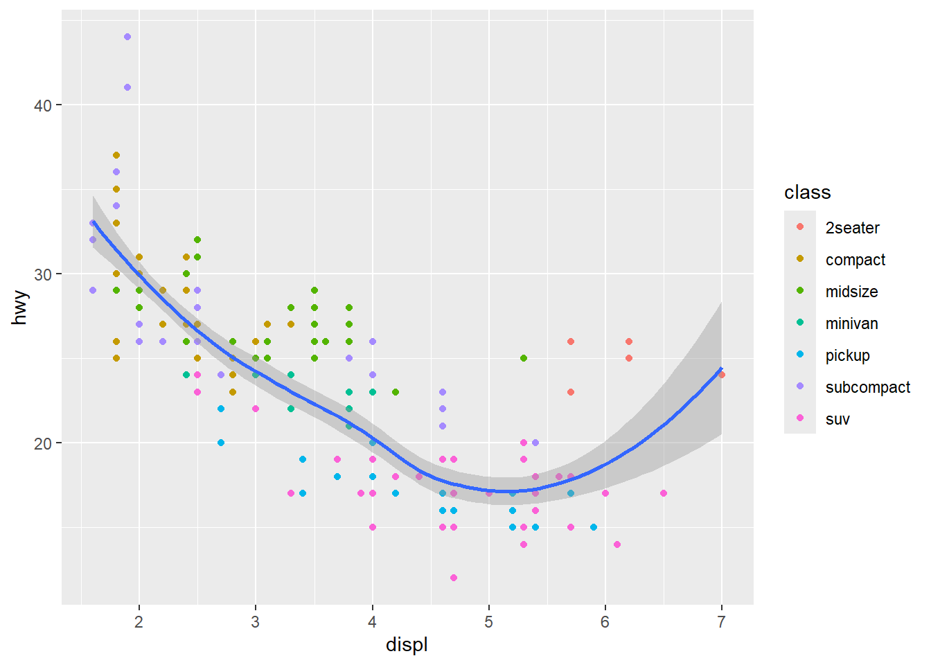 geom_smooth()ggplot(mpg, aes(x = displ, y = hwy, color = class)) +