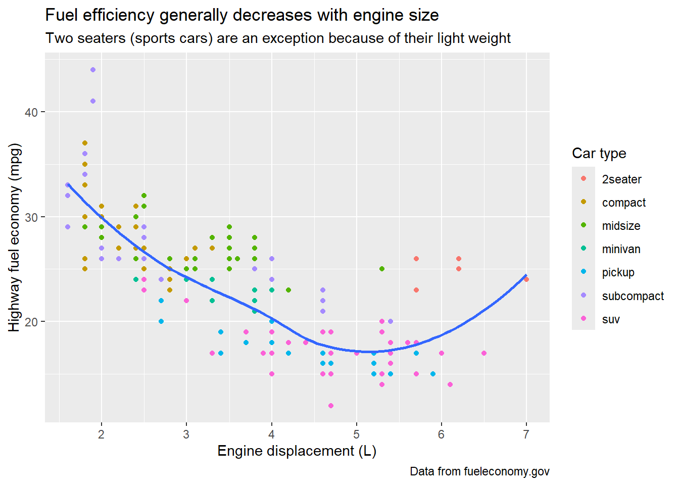 title = "Fuel efficiency generally decreases with engine size",