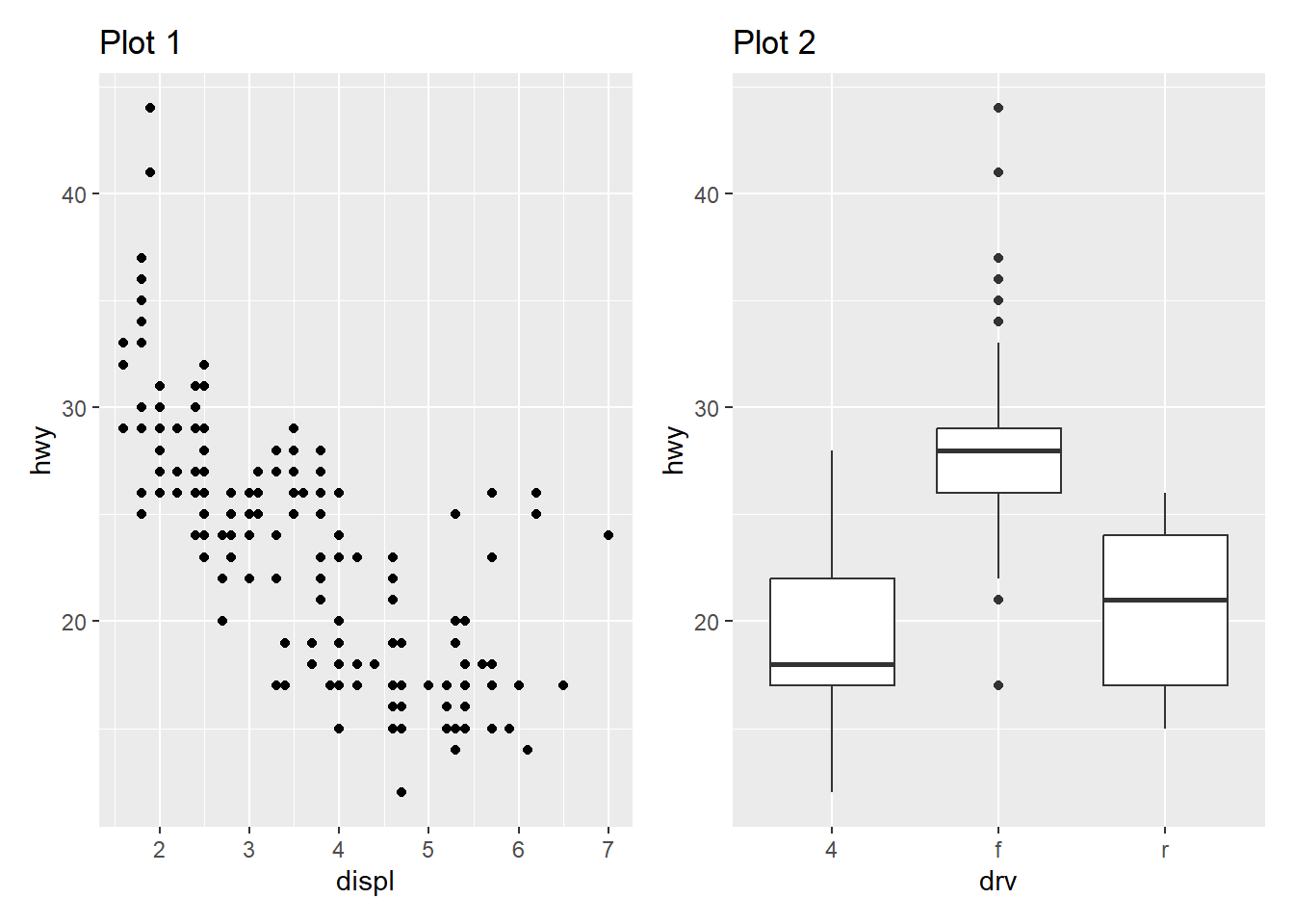 p2 <- ggplot(mpg, aes(x = drv, y = hwy)) +