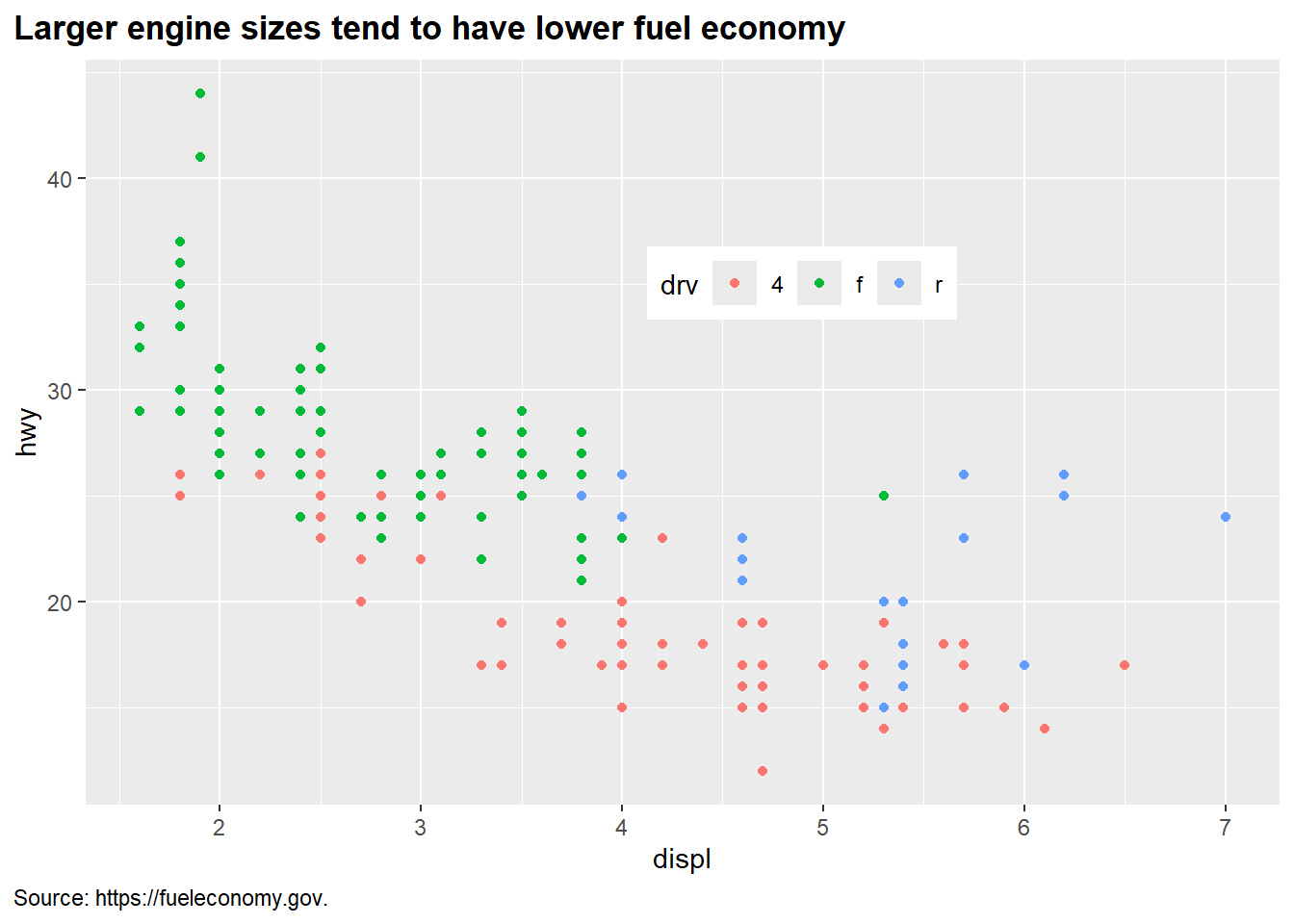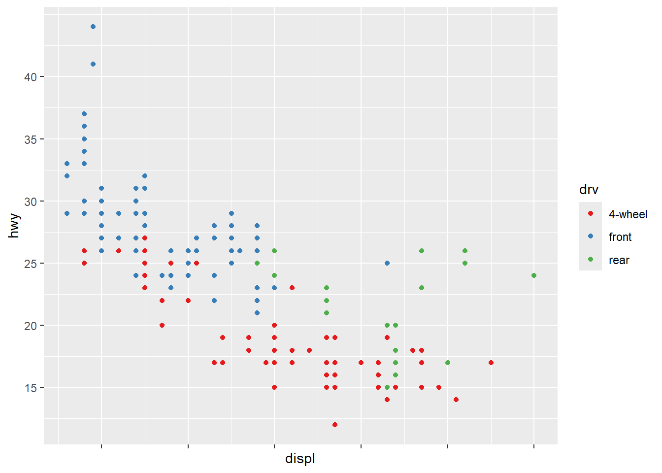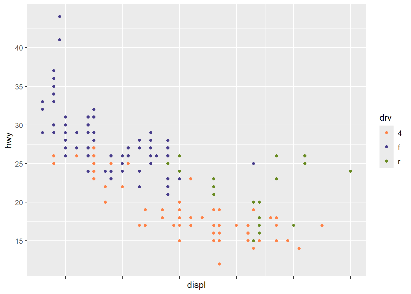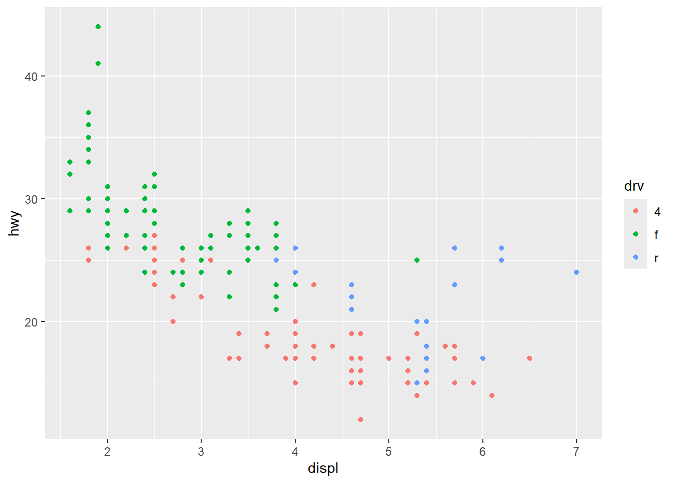 ggplot(mpg, aes(x = displ, y = hwy, color = drv)) +