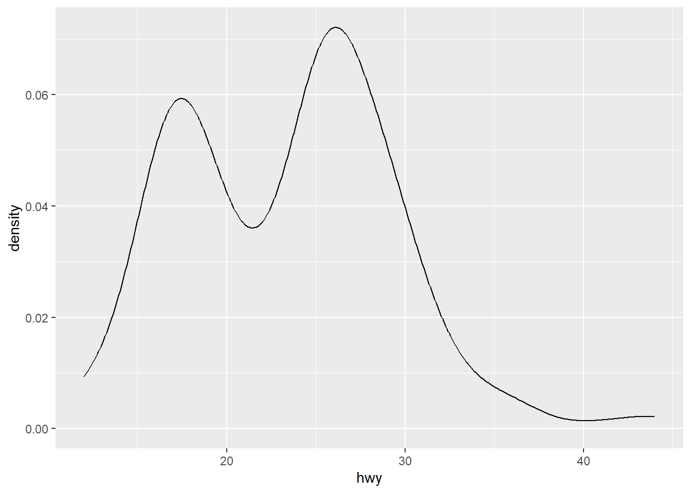 geom_density()ggplot(mpg, aes(x = hwy)) +