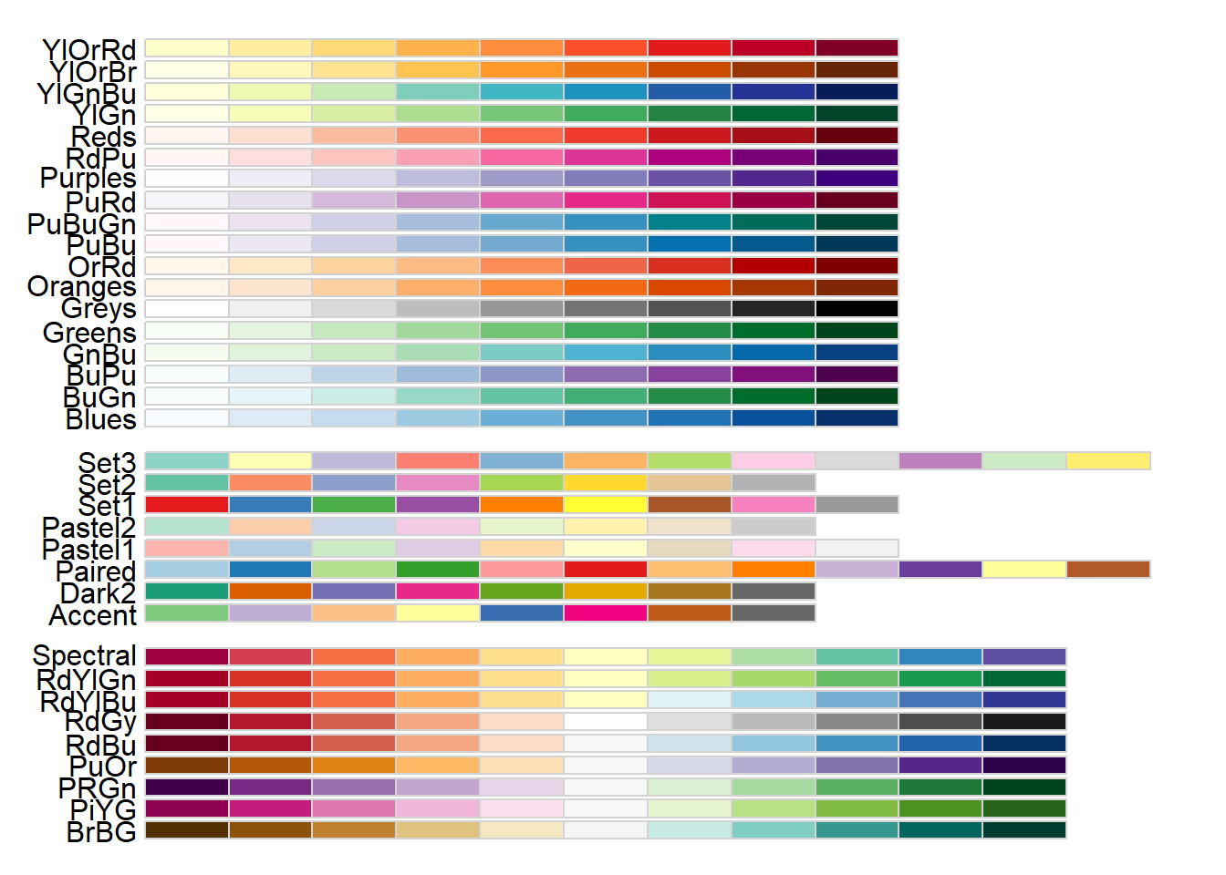 scale_color_brewer(palette = "Set1", labels = c("4" = "4-wheel", "f" = "front", "r" = "rear"))scale_color_brewer() 함수는 ColorBrewer 컬러 스케일을 사용한 것인데 익히고 있으면 많은 도움이 된다. 여기에는 다양한 색배열(color schemes)이 제시되어 있는데, 이것을 ggplot2 패키지에서는 팔레트(palette)라고 부른다. 그림 19 에는 다양한 브루어 컬러 팔레트가 제시되어 있는 데 왼편의 문자가 팔레트의 이름이고(예: YlOrRd), scale_color_brewer() 함수 속에 막바로 사용가능하다. 첫번째 군은 정량적 팔레트 중 순차형(sequential) 팔레트들이고, 두번째 군은 정성적 혹은 범주형(categorical) 팔레트들이고, 세번째 군은 정량적 팔레트 중 분기형(diverging) 팔레트들이다. 변수의 성격에 가장 적절한 팔레트를 선택하는 것이 관건이다.