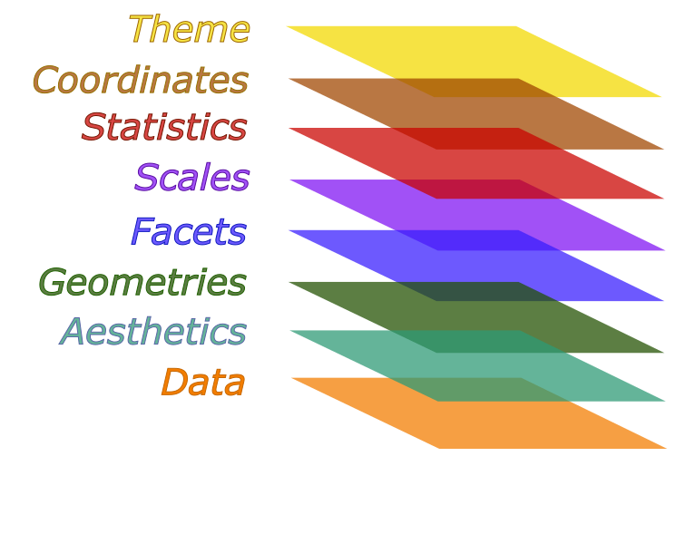 이 8개 구성 요소 중 가장 중요한 것은 ’시각속성(aesthetics)’과 ’기하객체(geometric objects)’이다. 기하객체가 그래프의 전체 구조 혹은 형식을 규정하는 것이라면, 시각속성은 기하객체의 외견을 규정한다. 기하객체는 그래프의 유형(예: 막대 그래프, 산포도 등)과 관련되고, 시각속성은 플롯의 그래픽 속성(예: 컬러, 크기, 모양 등) 혹은 시각 변수(visual variable)과 관련된다. 이 두 가지는 독립적인 요소이지만, 어느 정도는 관련되어 있기도 하다. 특정한 기하객체는 오로지 특정한 시각속성과만 결합한다. 예를 들어 포인트 기하 객체(geom_point())는 크기(size) 시각속성과 관련되지만, 라인 기하객체(geom_line())는 크기 시각속성과는 관련되지 않고 라인폭(linewidth) 시각속성과만 관련되는 식이다.