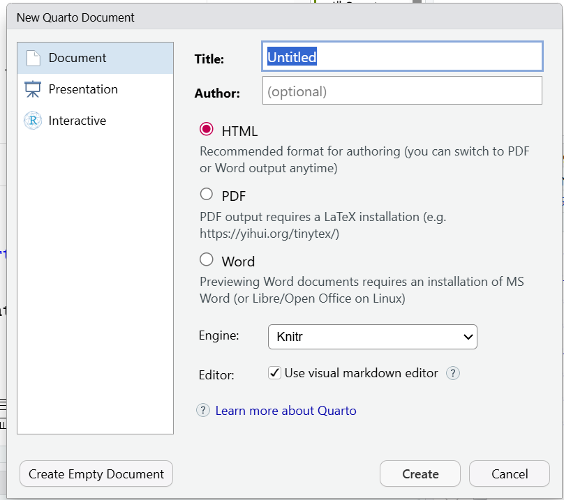 File > New File > Quarto Document를 실행한다. Title과 Author란에 적절한 텍스트를 기입하고 아래에 위치한 Create 버튼을 클릭한다.