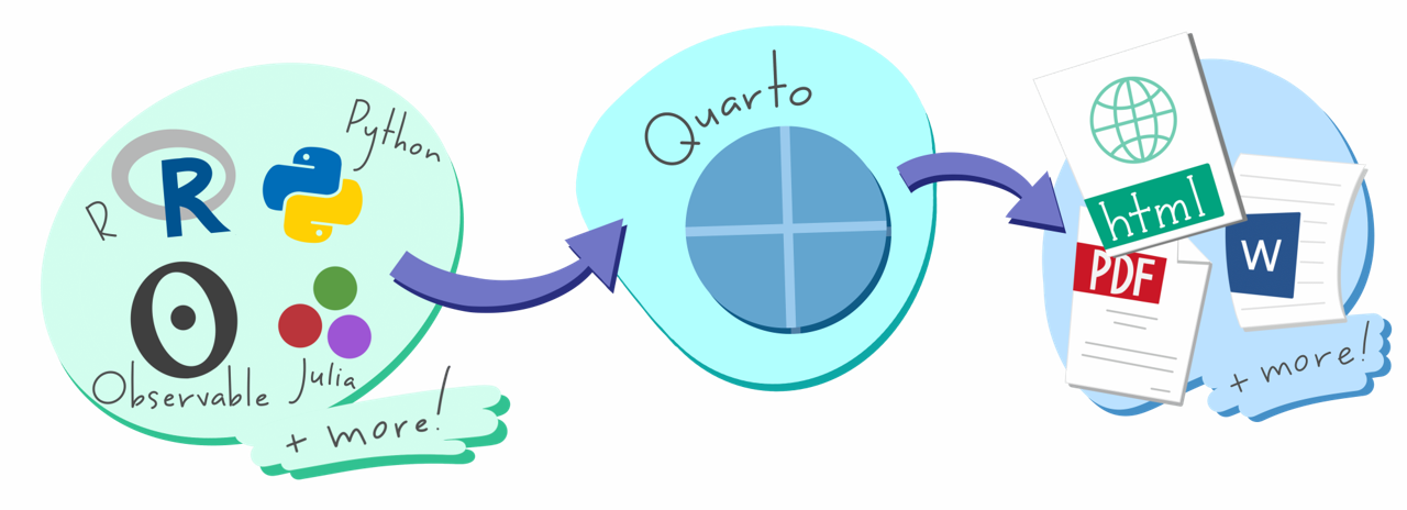 원래 R 커뮤니티에는 유사한 기능을 수행하는 RMarkdown이라는 도구가 존재했고 여전히 많은 사람들이 사용하고 있다. Quarto는 기존의 RMarkdown에 ’통합’이라는 키워드를 적용시켜 보다 발전된 형태의 저작 시스템으로 거듭난 것이다. 우선 Quarto는 다양한 오픈소스 프로그래밍 언어에서 사용될 수 있다(R, Python, Julia, Observable). 둘째, Quarto는 출판물의 다양한 형식에 구애되지 않는 일관성있는 저작 시스템을 제공한다.