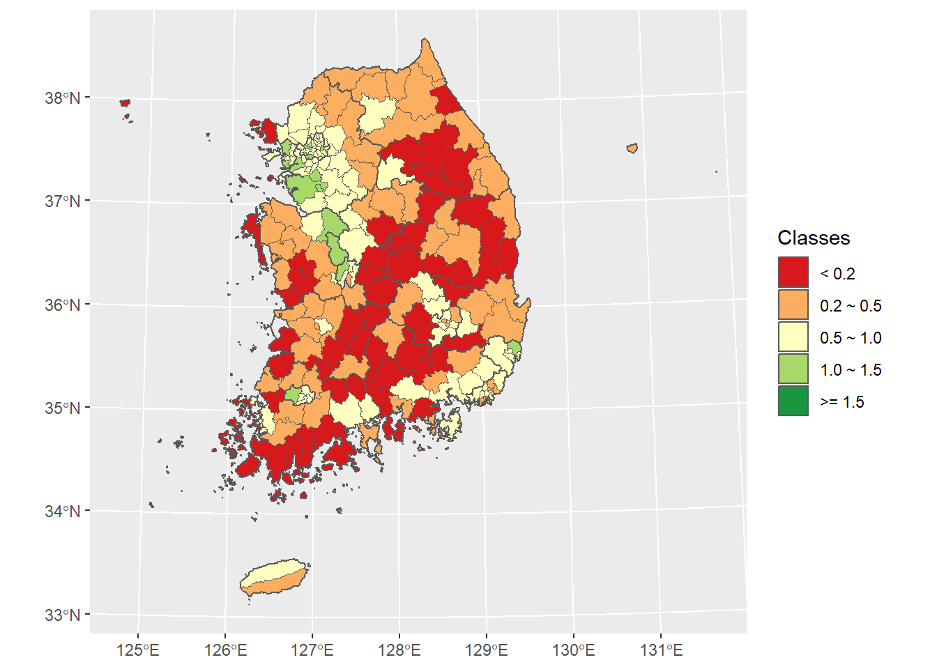 labels = c("< 0.2", "0.2 ~ 0.5", "0.5 ~ 1.0", "1.0 ~ 1.5", ">= 1.5"),