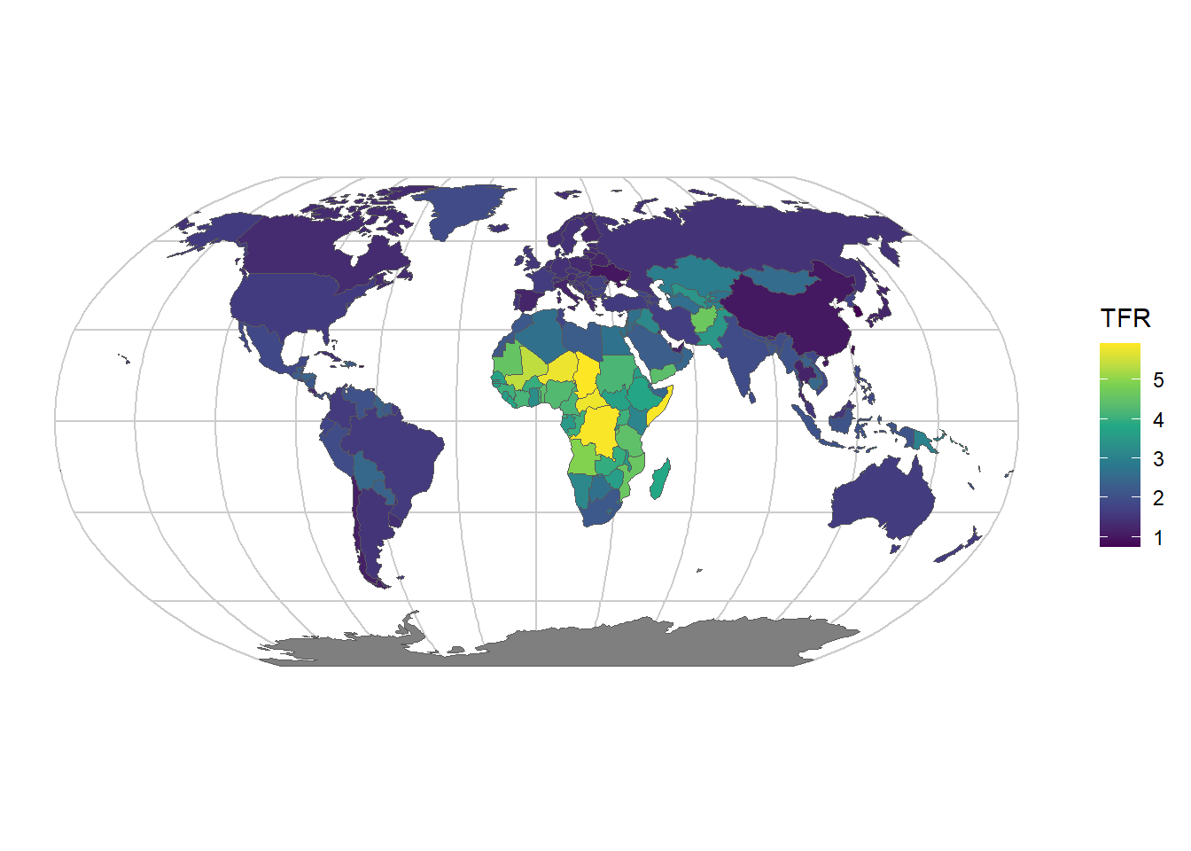 geom_sf(data = world_data, aes(fill = TFR, text = name_long)) + # text는 나중에 인터랙티브 지도에 사용