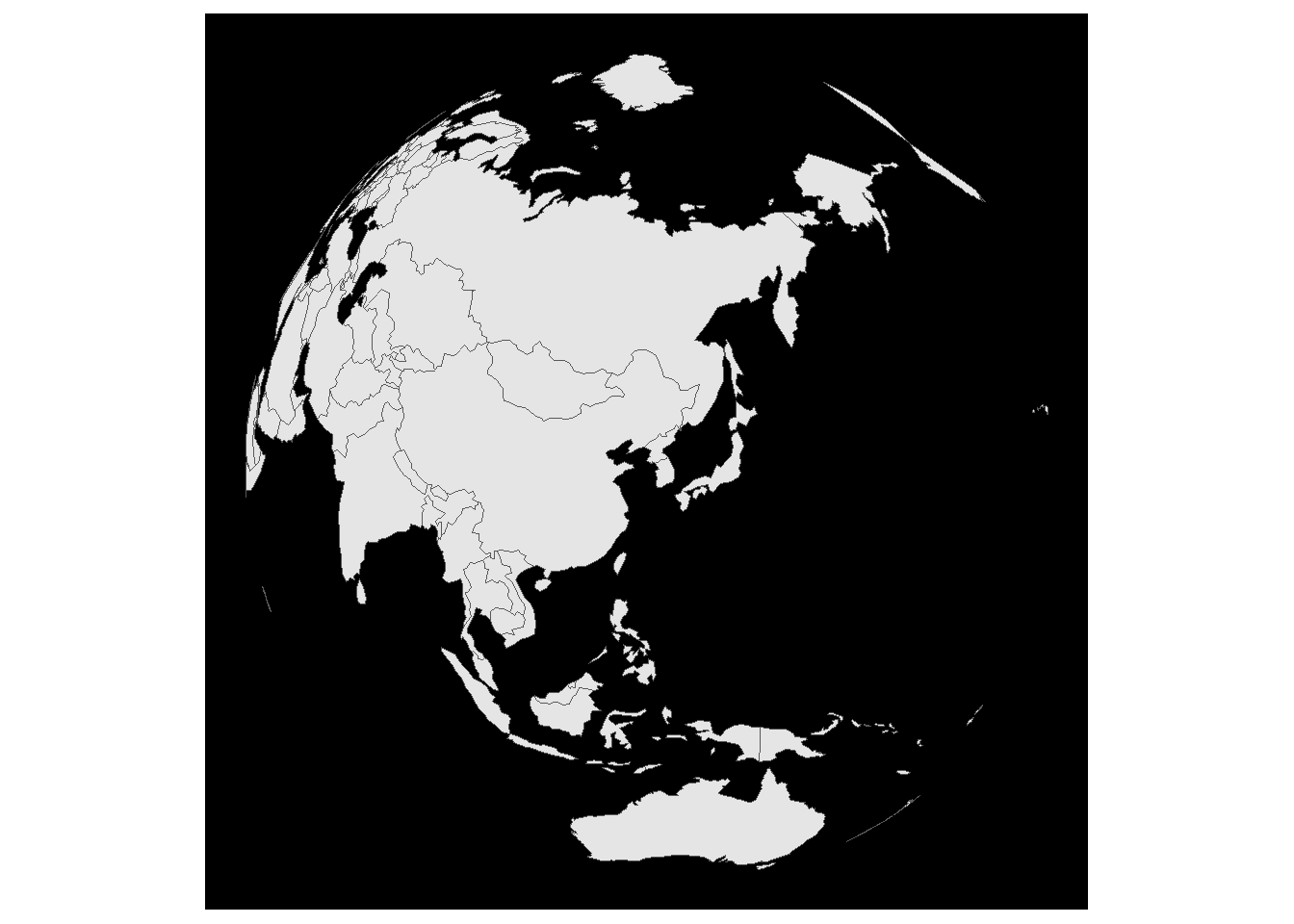 world_mapcoord_sf의 crs 설정을 변경하면 다른 투영법의 지도도 만들 수 있다. crs를 변경하여 개인적으로 좋아하는 대한민국 중심의 정사 도법(Orthographic Projection) 지도를 그려본다. 마치 지구본을 보는 듯한 지도를 그릴 수 있다. 혹시 다른 투영법이 적용된 지도를 그리고 싶다면 ChatGPT에게 물어보거나 epsg.io에서 PROJ.4 문자열을 찾아볼 수도 있다.