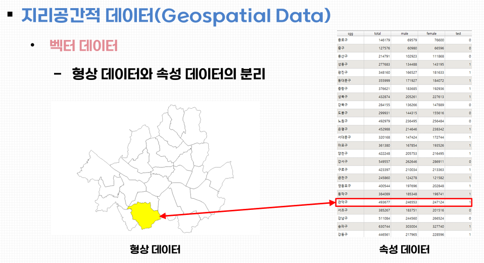 벡터 데이터는 지리공간적 사상을 포인트, 라인, 폴리곤 피처로 구분하고, 개별 피처를 형태와 위치를 개별 피처를 구성하고 있는 버택스의 좌표값을 저장함으로써 구현하는데, 이러한 정보를 담고 있는 것을 형상 데이터라고 한다. 예를 들어 우리나라 17개 시도에 대한 디지털 행정구역도가 여기에 해당한다. 이에 반해 속성 데이터는 포인트, 라인, 폴리곤 등으로 재현된 개별 피처의 다양한 특성을 가지고 있는 것으로 보통 테이블 데이터라고 한다. 예를 들어, 우리나라 17개 시도의 인구수, 인구성장률, 순이동률과 같은 것이다. 형상 데이터가 지리공간적 데이터의 특수성을 더 잘 반영하기 때문에 보통 형상 데이터를 공간 데이터라고도 하면, 벡터 데이터에서는 이 두 종류의 데이터가 기본적으로 독립적이며 보통은 느슨한 형태로 결합되어 있다.