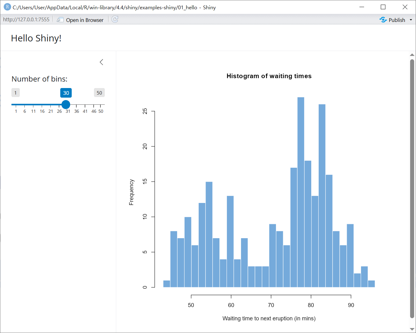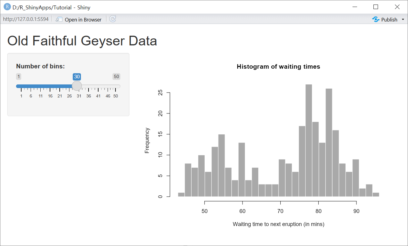 app.R에서 스크립트 윈도우 오른쪽 상단에 위치한 Run App 버튼을 클릭하면 그림 3 과 같은 웹 앱이 새로운 윈도우에 생성된다. 왼편의 슬라이더를 움직이면 오른편의 히스토그램이 변한다는 점을 확인한다. 즉 빈(bin)의 개수를 달리하면서 데이터 분포를 탐색해보기 위한 단순한 웹 앱이 만들어진 것이다.