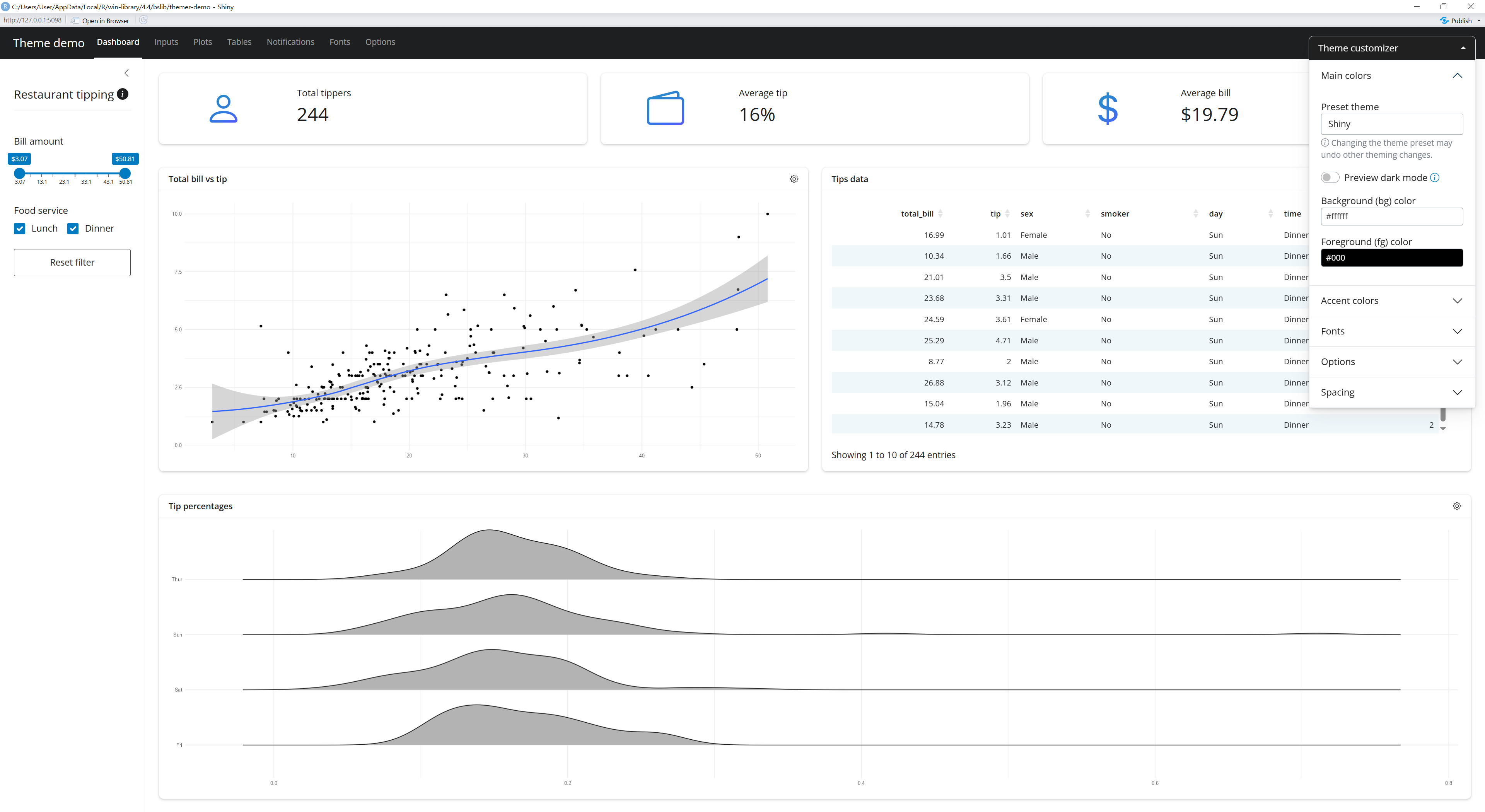 콘솔에서 함수를 실행하면, 버튼, 카드, 입력 위젯 등 대표 UI 컴포넌트에 테마를 적용해볼 수 있고, 색상 대비, 타이포그래피, 여백 등을 한눈에 점검할 수 있을 뿐만 아니라, 테마 수정의 결과를 즉시 확인해 볼 수 있다. 그림 8 에서 볼 수 있는 것처럼 오른편의 Theme customizer를 조작하여 이러한 기능을 활용해 볼 수 있다.