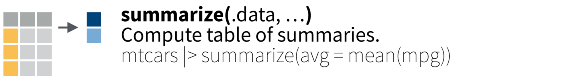 summarize(): 그룹별로 변수(들)의 요약 통계량을 산출하여 새로운 변수(들)로 저장