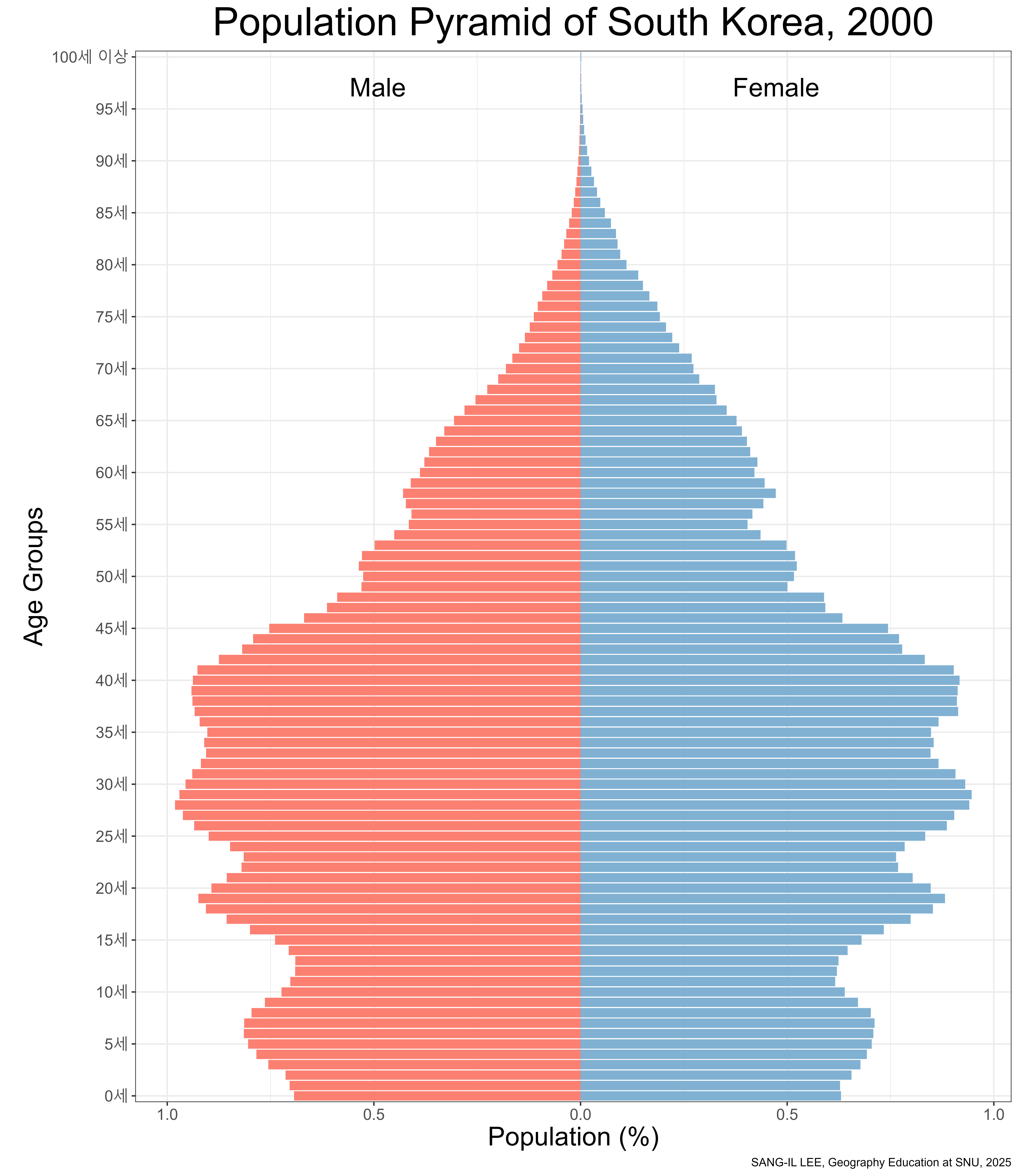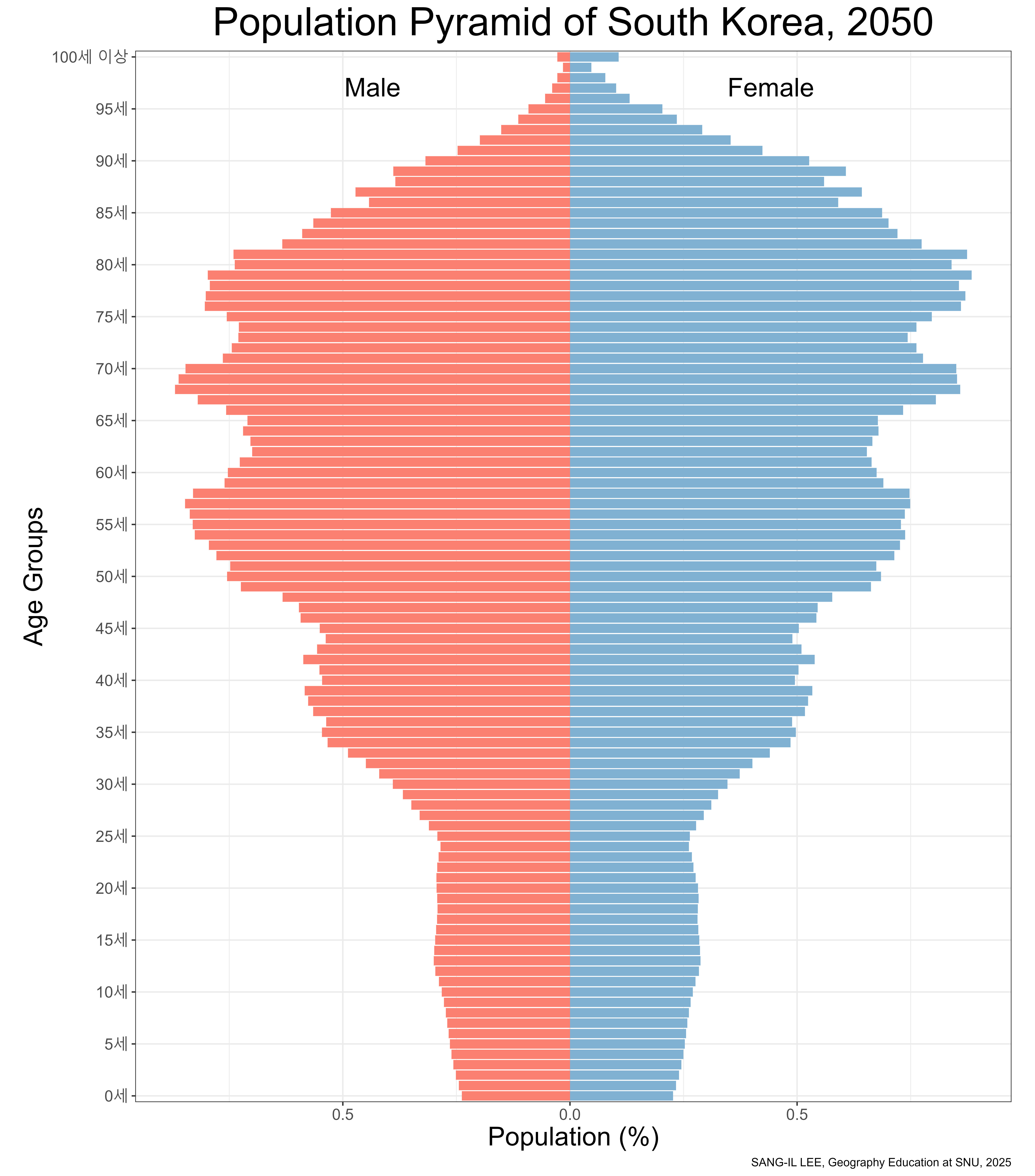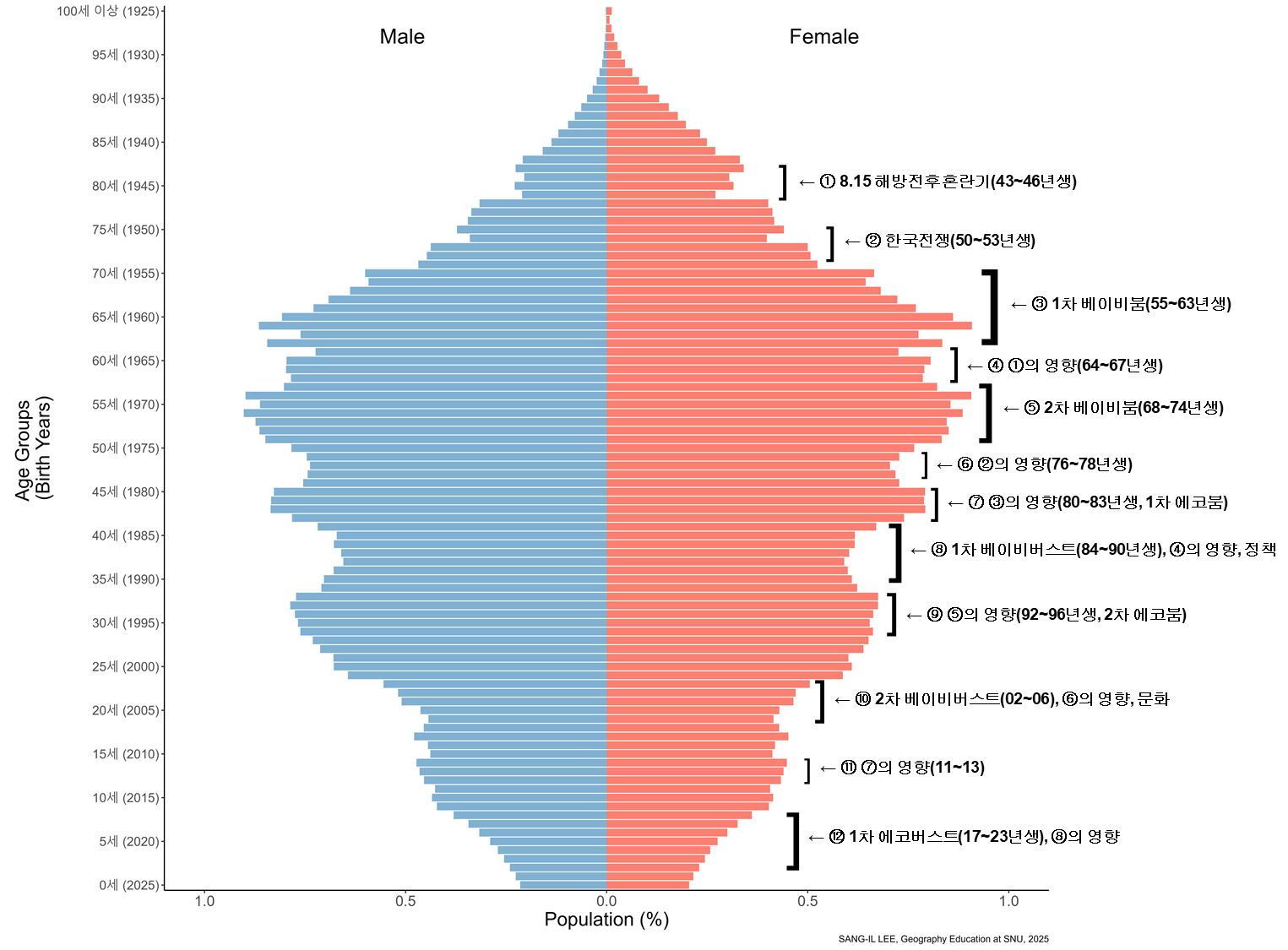 수평축: 연령(층)별 인구 수 혹은 인구 비중/ 남녀 구분